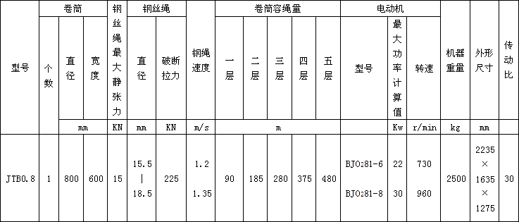 絞車主要性能參數(shù)及外形尺寸